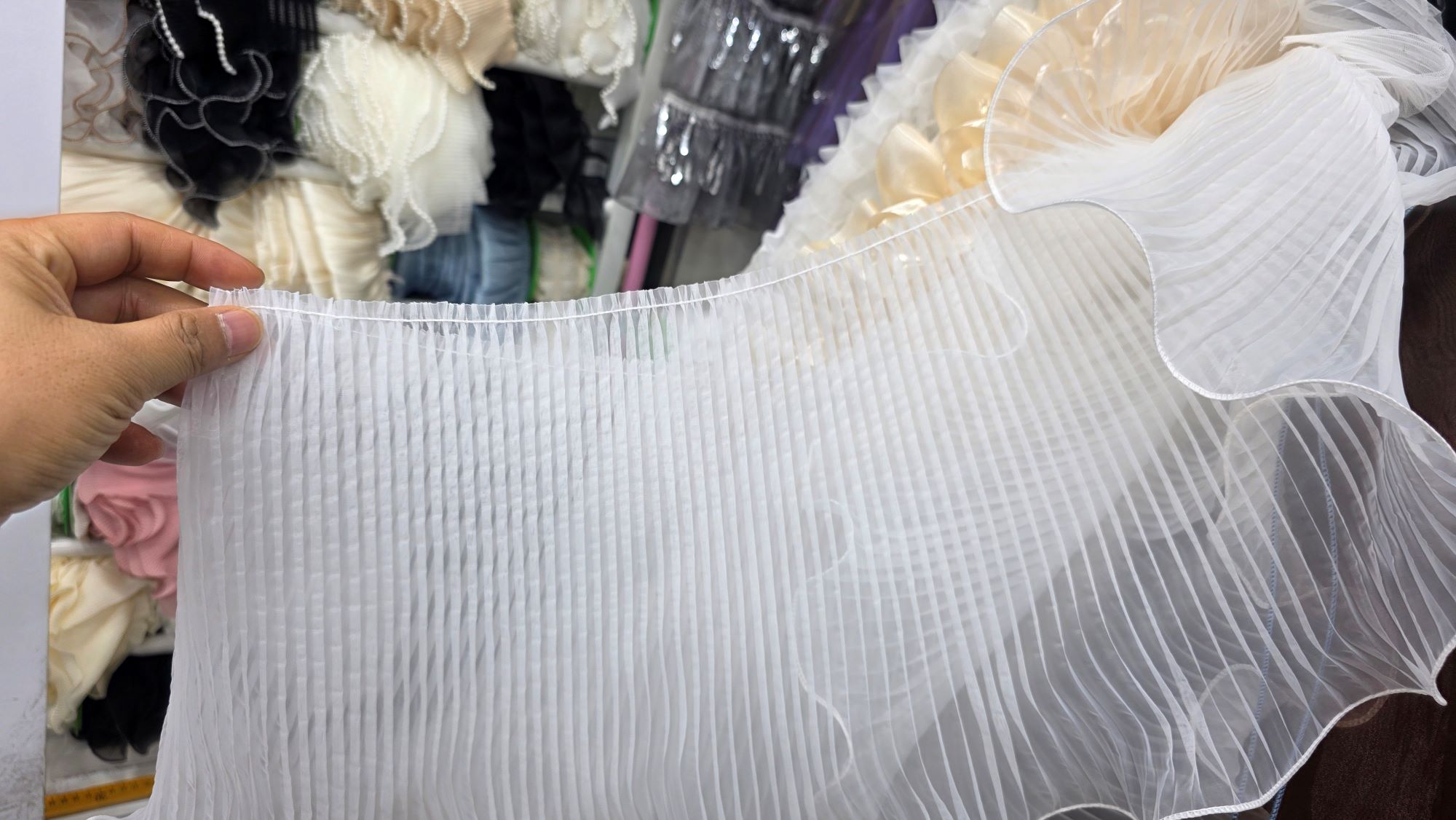这次行程的核心目的,是为客户下一季的连衣裙、西装外套以及大衣系列寻找最完美的底层面料与辅料(如纽扣、珍珠配饰等)。